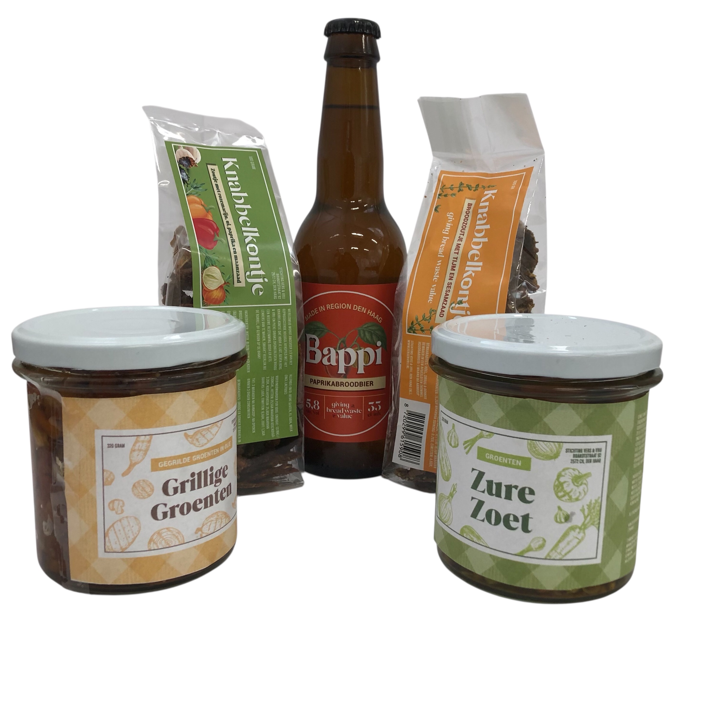 Dit pakket bevat 2 potjes met smakelijke groenten (op zoetzuur en/of in de olie), een smaakvol biertje (Bappi of De Bottel), en twee zakjes met overheerlijke Knabbelkontjes.